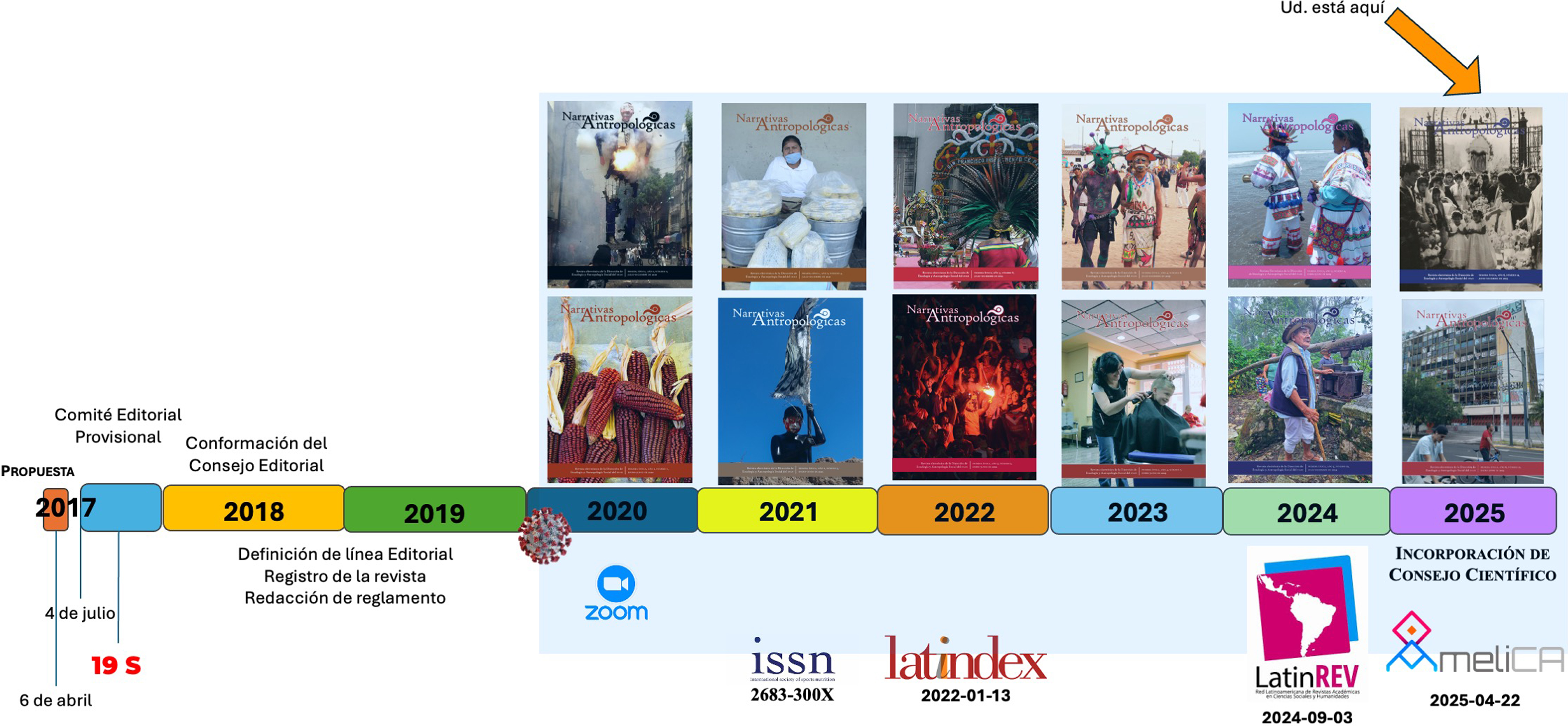 Es importante mencionar que la revista se propuso durante la gestión de la Mtra. Amparo Sevilla Villalobos como directora de la deas; ella brindó todo su apoyo durante el proceso. Los trabajos iniciaron el 4 de julio de 2017, con el comité editorial provisional, que posteriormente se conformó como Consejo Editorial, integrado por los colegas de la deas: Alfonso Barquín Cendejas, Amparo Sevilla Villalobos, Eliana Acosta Márquez, Giovanna Gasparello, José Iñigo Aguilar Medina, Laura Elena Corona de la Peña y Verónica Ruiz Lagier.